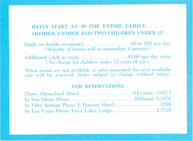 Rates from the first Disneyland Hotel brochure in 1955. This brochure was used from October 1955 until mid June 1956 when a second, similar brochure was used listing the extra rooms and amenities then opened at the Hotel.