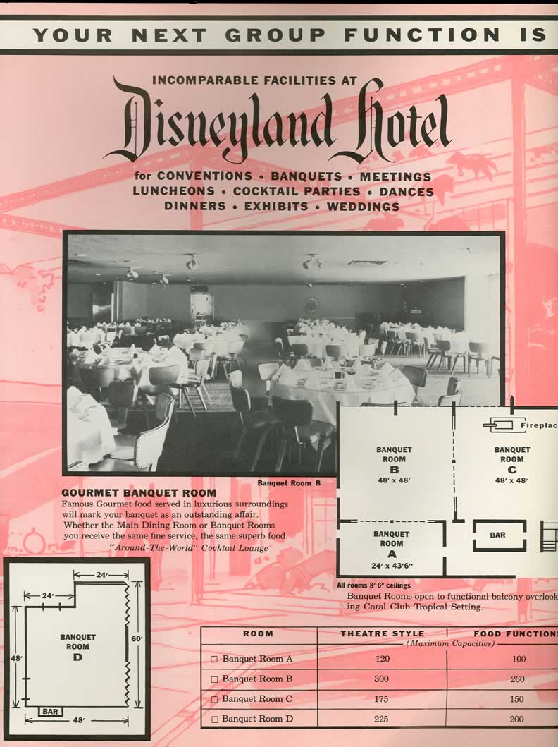 1956 convention brochure - part 3. This was the very first brochure put out to attract business people. This was before the Magnolia and Embassy Rooms and the Hotel had limited convention facilities. Conference rooms could only accommodate up to 50 people maximum however, the rooms could be opened up creating one large room which could hold up to 140 people. This is a very rare brochure. |