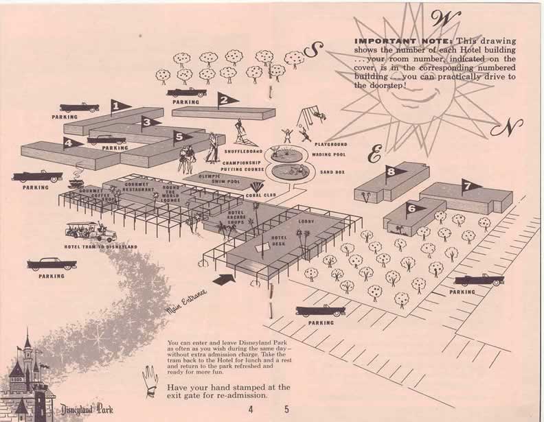 Inside the 1956 brochure is the first layout drawing of the Hotel's grounds. A total of eight guest room structures were listed as well as the restaurants, lobby, pool, play areas, parking lots, and Hotel tram to Disneyland.