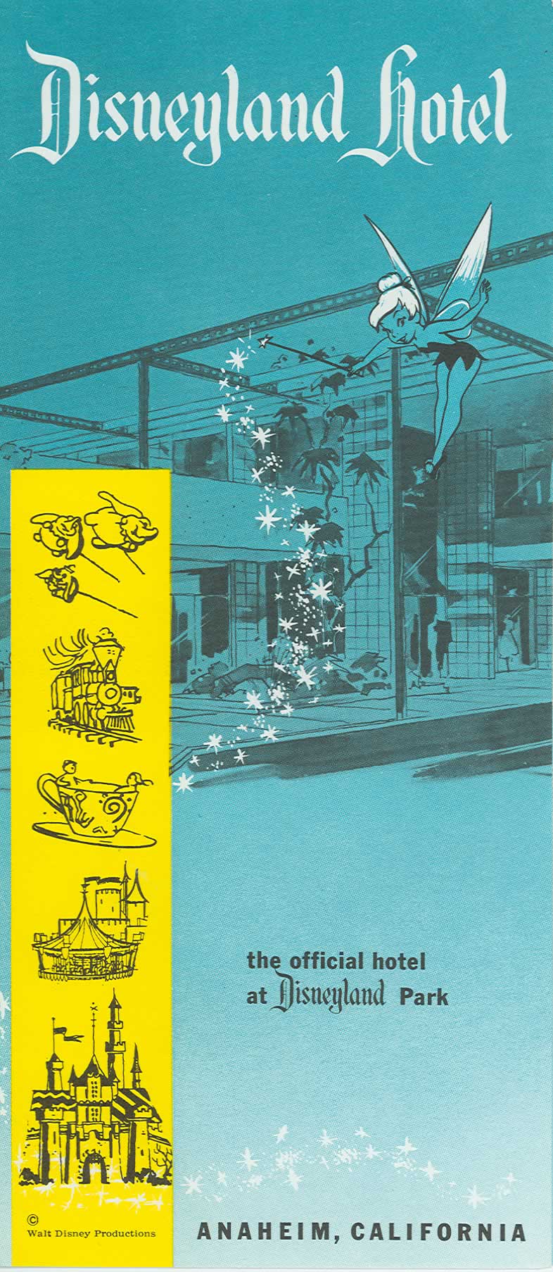 1959 Hotel brochure. Rooms now start at $16 all the way to $22. Brochures prior to this one were listed at the bottom “Wrather-Alvarez Hotels, Inc.” With the buyout of Helen Alvarez in mid 1958, her name was eliminated from all paper material. These items (with the Alvarez name affixed) are the most rare of Disneyland Hotel ephemera. |