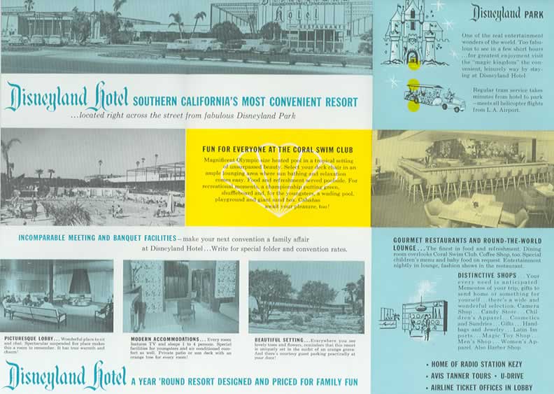Inside the 1959 Disneyland Hotel brochure. Radio station KEZY 1190 AM is now listed, broadcasting from inside the Disneyland Hotel.