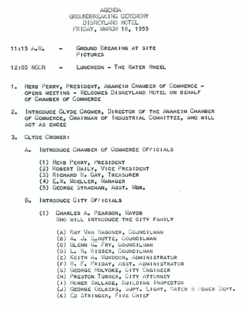 Schedule of events for the Disneyland Hotel groundbreaking ceremony held on Friday, March 18, 1955.