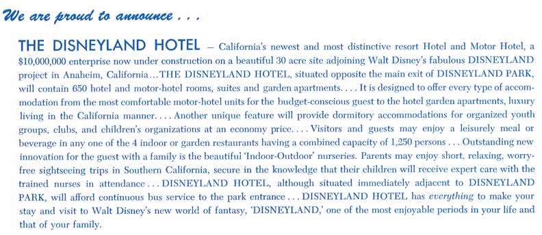 This is possibly the rarest of Disneyland Hotel paper items. A 1955 pre-opening brochure that was available at certain Disneyland shops and at a roadside stand in front of the Disneyland Hotel's construction site on West Street.