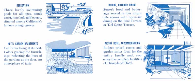 The second half of the interior for the pre-opening brochure. Trivia question-which amenity is listed that was never actually a part of the Disneyland Hotel?