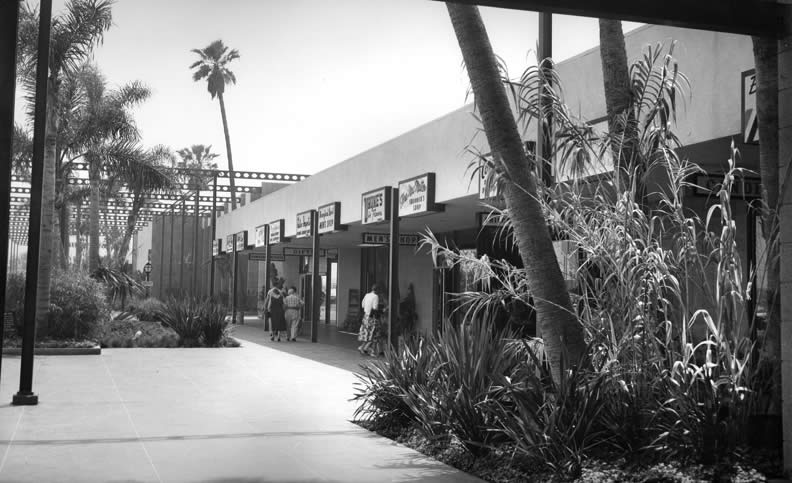 Hotel grounds 2 A very early photograph showing the beautiful landscaping and first shops at the Disneyland Hotel. This was taken just after the official Disneyland Hotel Grand Opening in August of 1956.