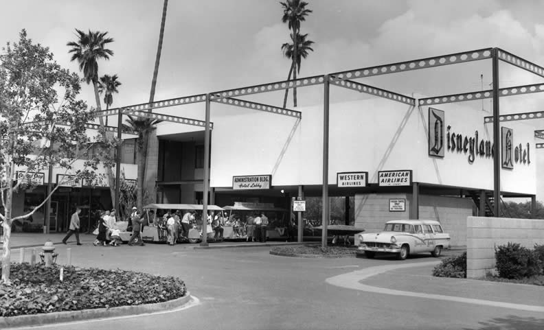 Hotel grounds 4 The Disneyland Hotel Tram picking up a load of passengers for a trip to the Magic kingdom. The station wagon on the right (with the Disneyland Hotel logo on the side) was used to transport special Hotel guests to the Park.