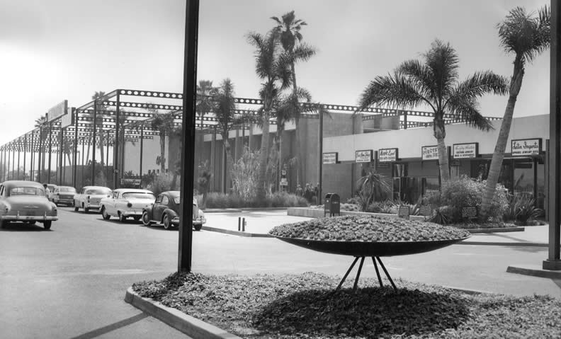 Hotel grounds 5 Another shot from under the overhang showing all the way down to the Gourmet Restaurant and Coffee Shop. That 50’s architecture and styling is just incredible. Note the space-age design of the planter in the foreground.