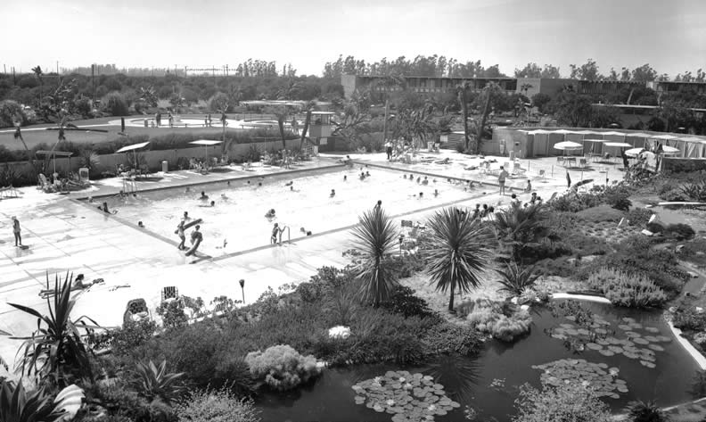 This is a wonderful shot featuring the Olympic Size pool, lush tropical landscaping, putting green, fountain, Coral Swim Club, guest accommodation structures and a wide open area where the first tower would eventually go in 1961/62. |