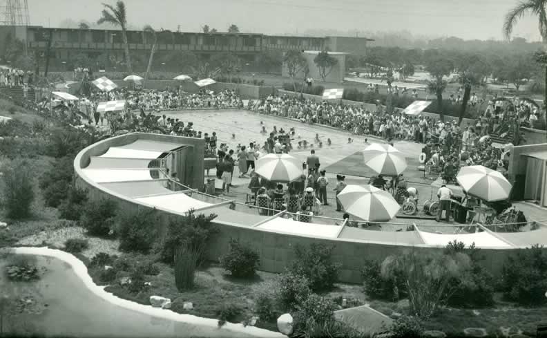 Poolside with the Mouseketeers. The drum set being set up bears the name Cubby on one bass drum and O’Brien on the other. This event was being filmed for television or possibly for the Mickey Mouse Club. The Disneyland Band is also seated and getting ready to play. Photo courtesy Molly Dolle |